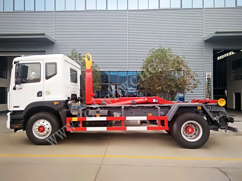 采用强度合金钢一体式主勾臂,加强型副梁,铸钢尾托轮,手电一体液压室内外操作,大臂双杠举升,加装双向平衡阀,液压完成上箱+下箱+锁紧+自卸等作业,实现一车配多箱的循环转运。
