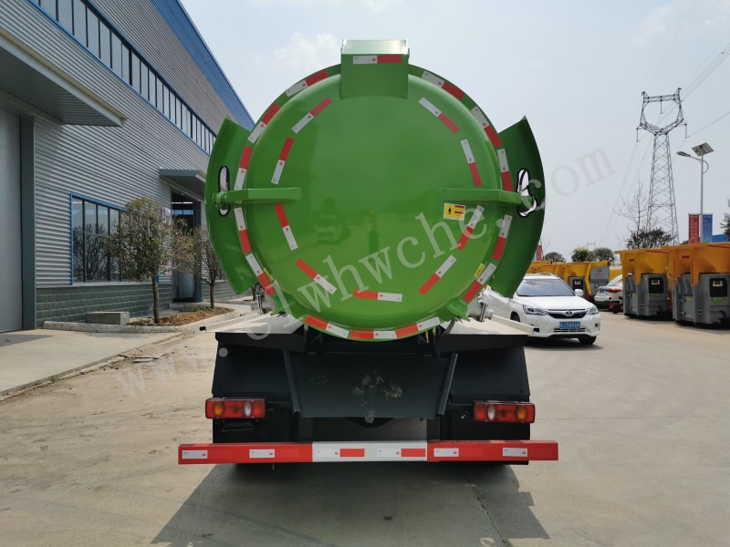 罐体采用4-5mm优质碳钢制作,圆形罐体,罐体前后封头采用圆弧蝶形封头,配拉杆式提升机,可挂120/240升垃圾桶,罐体底部配双缸液压举升自卸,罐体尾门液压打开和锁紧+手动锁紧装置,罐尾设液体自流阀,液位窗,后门液压开启,带工具箱。
