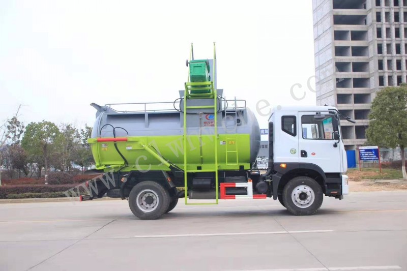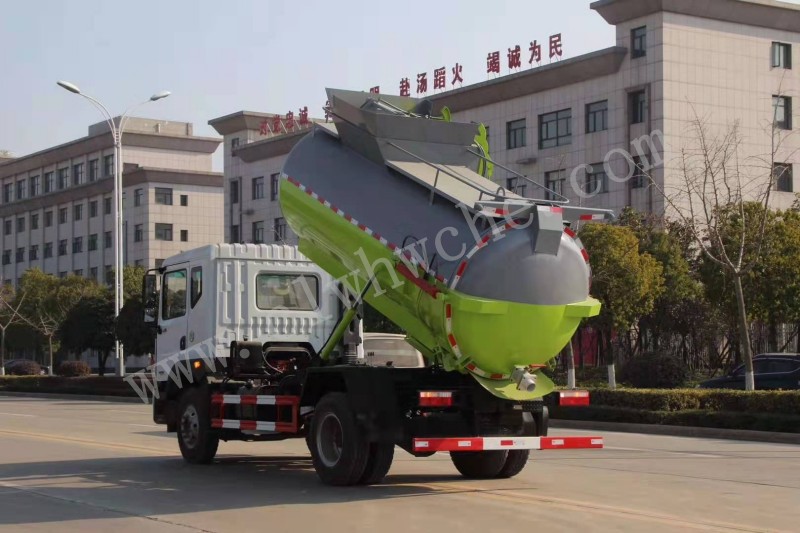 罐体采用4-5mm优质碳钢制作,圆形罐体,罐体前后封头采用圆弧蝶形封头,配拉杆式提升机,可挂120/240升垃圾桶,罐体底部配双缸液压举升自卸,罐体尾门液压打开和锁紧+手动锁紧装置,罐尾设液体自流阀,液位窗,后门液压开启,带工具箱。