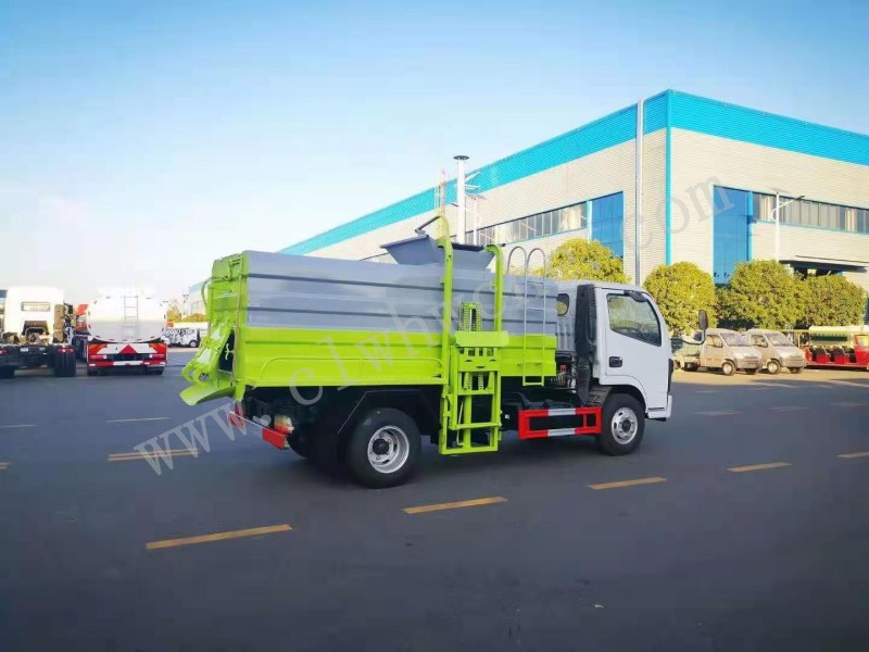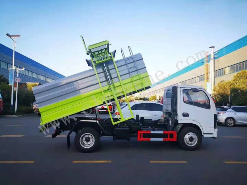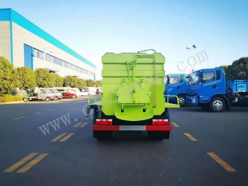 罐体采用4-5mm优质碳钢制作,方形罐体,罐体前后封头采用圆弧蝶形封头,配拉杆式提升机,可挂120/240升垃圾桶,罐体底部配双缸液压举升自卸,罐体尾门液压打开和锁紧+手动锁紧装置,罐尾设液体自流阀,液位窗,后门液压开启,带工具箱。