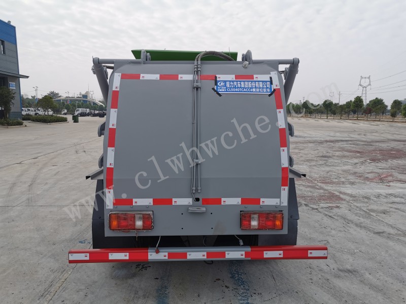 罐体采用4-5mm优质碳钢制作,方形罐体,罐体前后封头采用圆弧蝶形封头,配拉杆式提升机,可挂120/240升垃圾桶,罐体底部配双缸液压举升自卸,罐体尾门液压打开和锁紧+手动锁紧装置,罐内设固液分离装置,罐尾设液体自流阀,液位窗,后门液压开启,带工具箱,洗手装置。