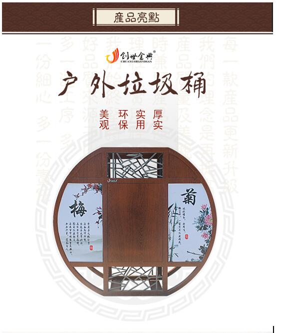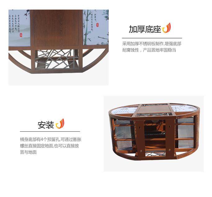③:整体表面处理采用热转印烤木纹工艺,并印有“梅兰竹菊”四君子户外专用图案,色彩鲜明,寿命长,无毒无味,附着力强等特点。