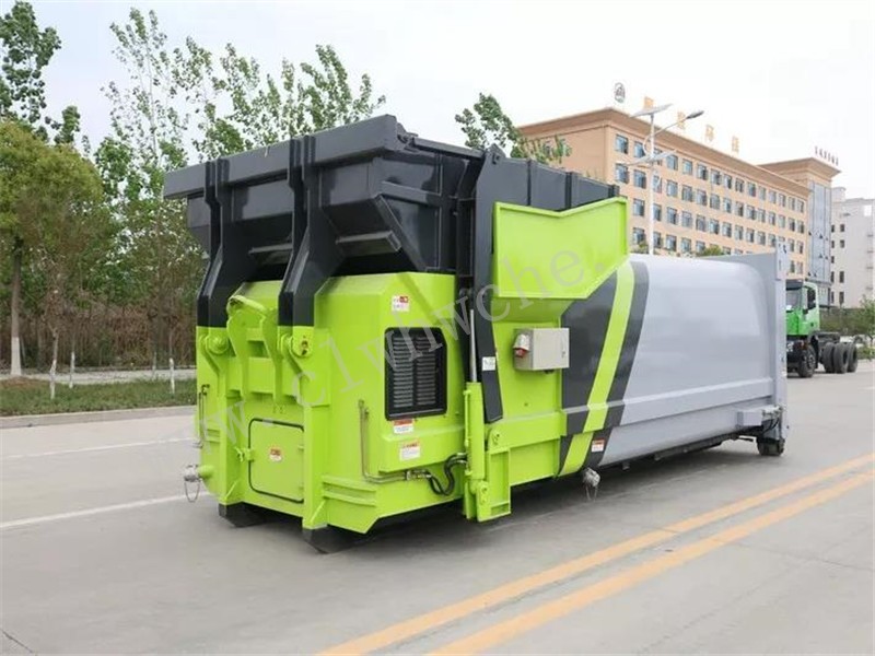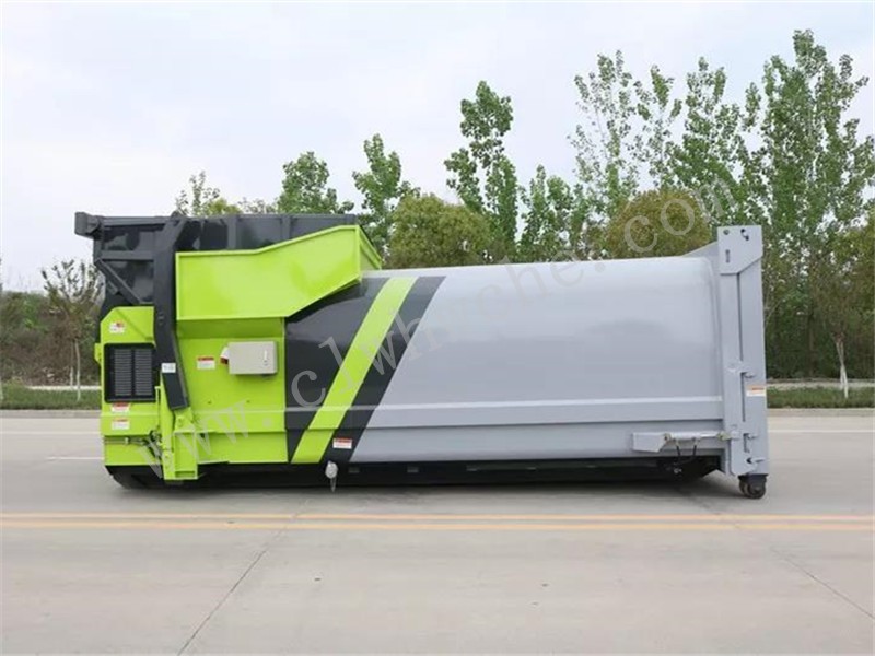 2、压缩机头:由动力单元(PLC 自动**)、“W”型压缩头(推铲)和装填腔组成,将料斗送入的松散垃圾压入垃圾箱内。压缩仓和推铲摩擦部位采用 NM500 耐磨板,使用寿命倍增;