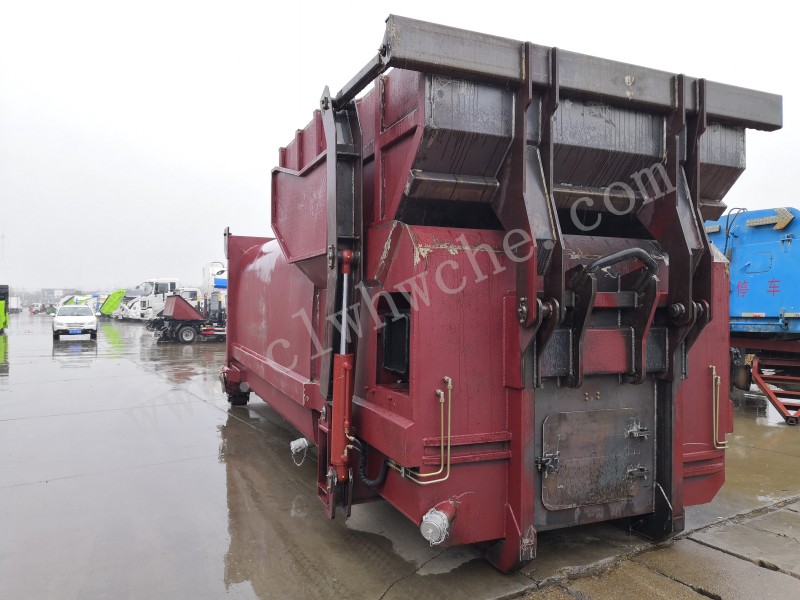 2、压缩机头:由动力单元(PLC 自动**)、“W”型压缩头(推铲)和装填腔组成,将料斗送入的松散垃圾压入垃圾箱内。压缩仓和推铲摩擦部位采用 NM500 耐磨板,使用寿命倍增;