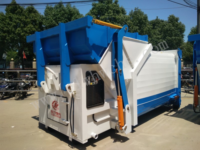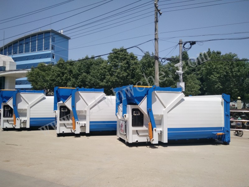 2、压缩机头:由动力单元(PLC 自动**)、“W”型压缩头(推铲)和装填腔组成,将料斗送入的松散垃圾压入垃圾箱内。压缩仓和推铲摩擦部位采用 NM500 耐磨板,使用寿命倍增;