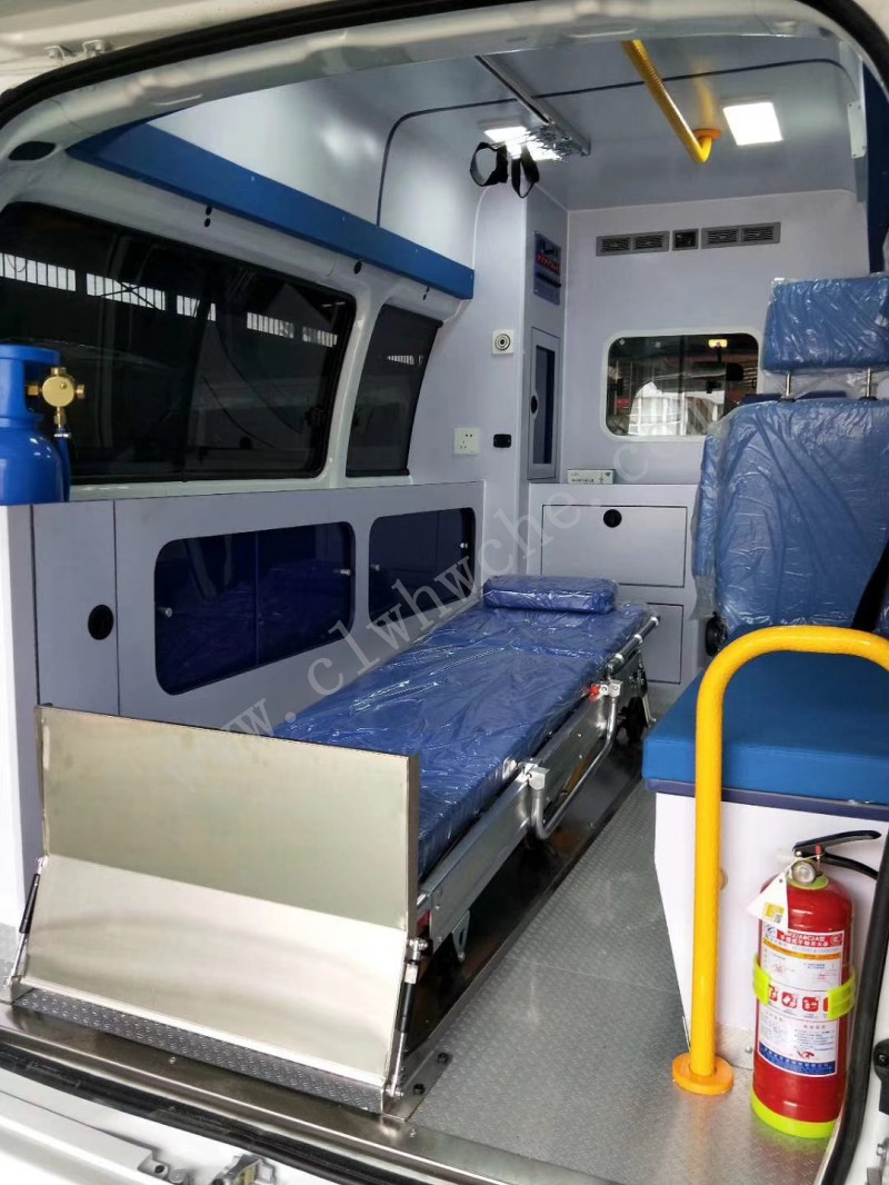 前顶装全蓝**灯**报器(100W)1套;折叠式担架1件;医药柜1件;固定安装10L氧气瓶1只;输液吊钩2只;消毒灯1只;污物桶1只;后舱空调和暖风;中隔断带滑窗1套;12V照明灯2个;500W逆变器1只;220V电源插座1组;医用耐磨塑胶地板;贴救护十字标志;左边长条椅软座垫、软靠背和安全带1套(或单人座椅2只)。
