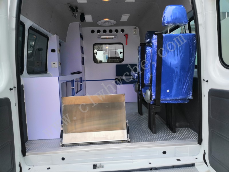 前顶装全蓝**灯**报器(100W)1套;折叠式担架1件;医药柜1件;固定安装10L氧气瓶1只;输液吊钩2只;消毒灯1只;污物桶1只;后舱空调和暖风;中隔断带滑窗1套;12V照明灯2个;500W逆变器1只;220V电源插座1组;医用耐磨塑胶地板;贴救护十字标志;左边长条椅软座垫、软靠背和安全带1套(或单人座椅2只)。