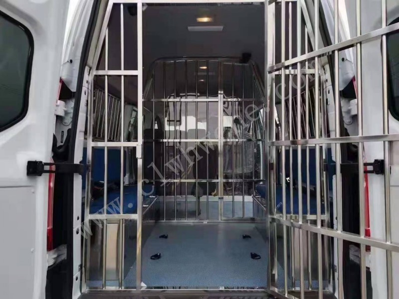 20、中隔栅栏:车内不锈钢囚笼隔断,开门,带门铰链及锁止插销。侧窗栅栏:不锈钢囚笼隔离栏。后窗栅栏:不锈钢囚笼隔离栏。尾隔栅栏:不锈钢囚笼隔断,带门铰链及锁止插销。