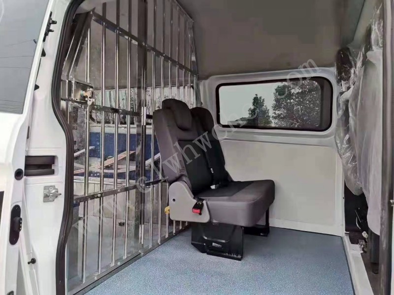 1、囚车设琶驾驶舱和押解舱两部分《驾驶舱座椅应当前后两排,不少于4座,后排座椅应当配置头枕、押解舱内不得有尖锐 凸出物,座椅应当配置两点式安全带、手铐固定装置,舱体底面 应当配I脚镣固定装置(公安标准GA702-2007)}。
