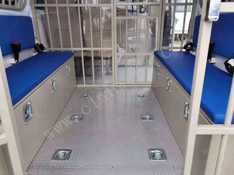 1、囚车设琶驾驶舱和押解舱两部分《驾驶舱座椅应当前后两排,不少于4座,后排座椅应当配置头枕、押解舱内不得有尖锐 凸出物,座椅应当配置两点式安全带、手铐固定装置,舱体底面 应当配I脚镣固定装置(公安标准GA702-2007)}。