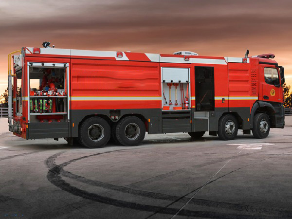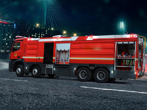 该泡沫消防车,整车主要由梅赛德斯-奔驰 Arocs 4158型消防车专用底盘、**乘员室、水罐、泵室、泵送系统、智能集成**系统、水**、水炮、随车消防器材以及其他附属**等组成。整车改装后载荷分配均匀,质心位置和稳定性计算**,内部空间布局合理,能充分满足操作人员的使用要求。
