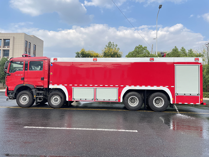 备注:选装右侧安装不同样式的装饰板和选装后部带拉梯架装置。罐体总容积为24.724立方米,水罐容积:20.900立方米,水罐尺寸:5840×2450×1530mm,泡沫液罐容积:3.824立方米,泡沫液罐尺寸:1070×2450×1530mm。整体式侧防护结构,后防护装置材料:Q23 **,截面尺寸:120×120mm,与车辆连接方式:螺栓连接,后防护离地高度:465mm, A BS生产企业为威伯科(上海)管理有限公司型号为4460046300。主要专用装置有CB10/100消防泵、PL80消防炮,水射程≥70m,泡沫射程≥65m。 |